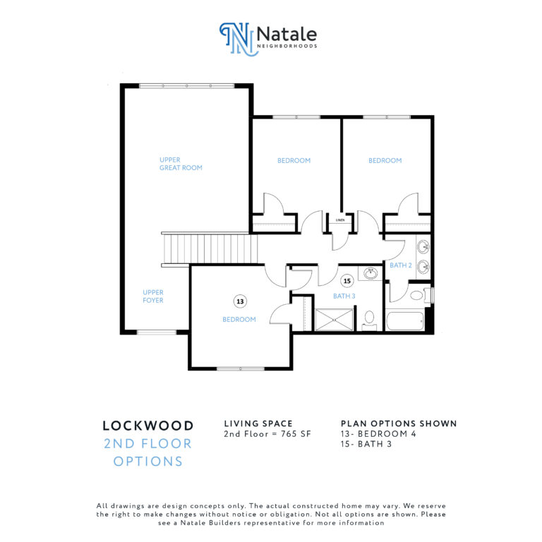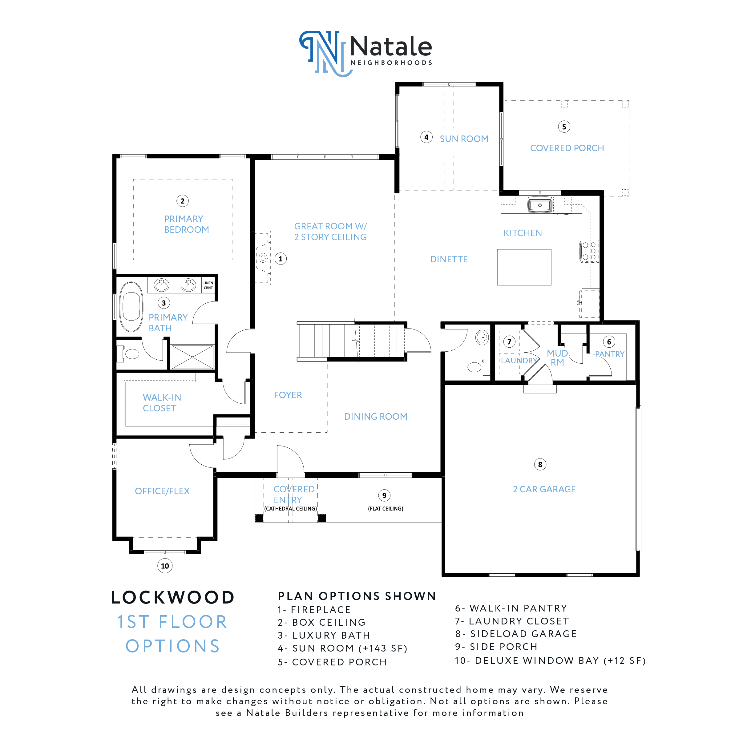 The Lockwood model offers several additional options that can be customized to suit your needs and preferences. For the first floor, some available options include a rear covered porch, 1-car garage, box ceiling in the primary bedroom, luxury bath, sunroom, walk-in pantry, sideload garage, 1-car sideload garage, full front porch, and a bay window. For the second floor, some available options are a laundry room, bonus room, a 4th bedroom, and a 3rd full bathroom. Is this the floorplan you’ve been envisioning? With Natale’s 50+ years of experience, let us begin building your dream home today.
