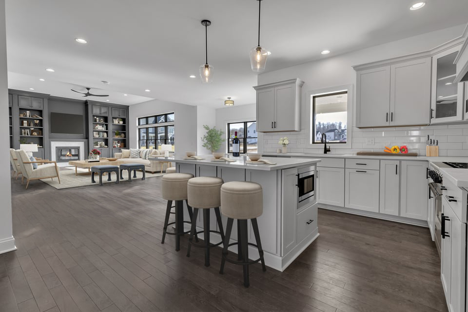 As you step into the front door of the Lucia, an impressive two-story foyer welcomes you. The dining room is located off of the foyer, across from the den/study. Moving through, you’ll pass by a convenient powder room before reaching the entertaining space at the back of the house. The grand open floorplan consisting of the great room, dinette area and sunroom, and the spacious kitchen, create a perfect space for gatherings. The great room boasts lofty ceilings and floods of natural light. Connecting with the great room, the mudroom provides convenient access to the garage.