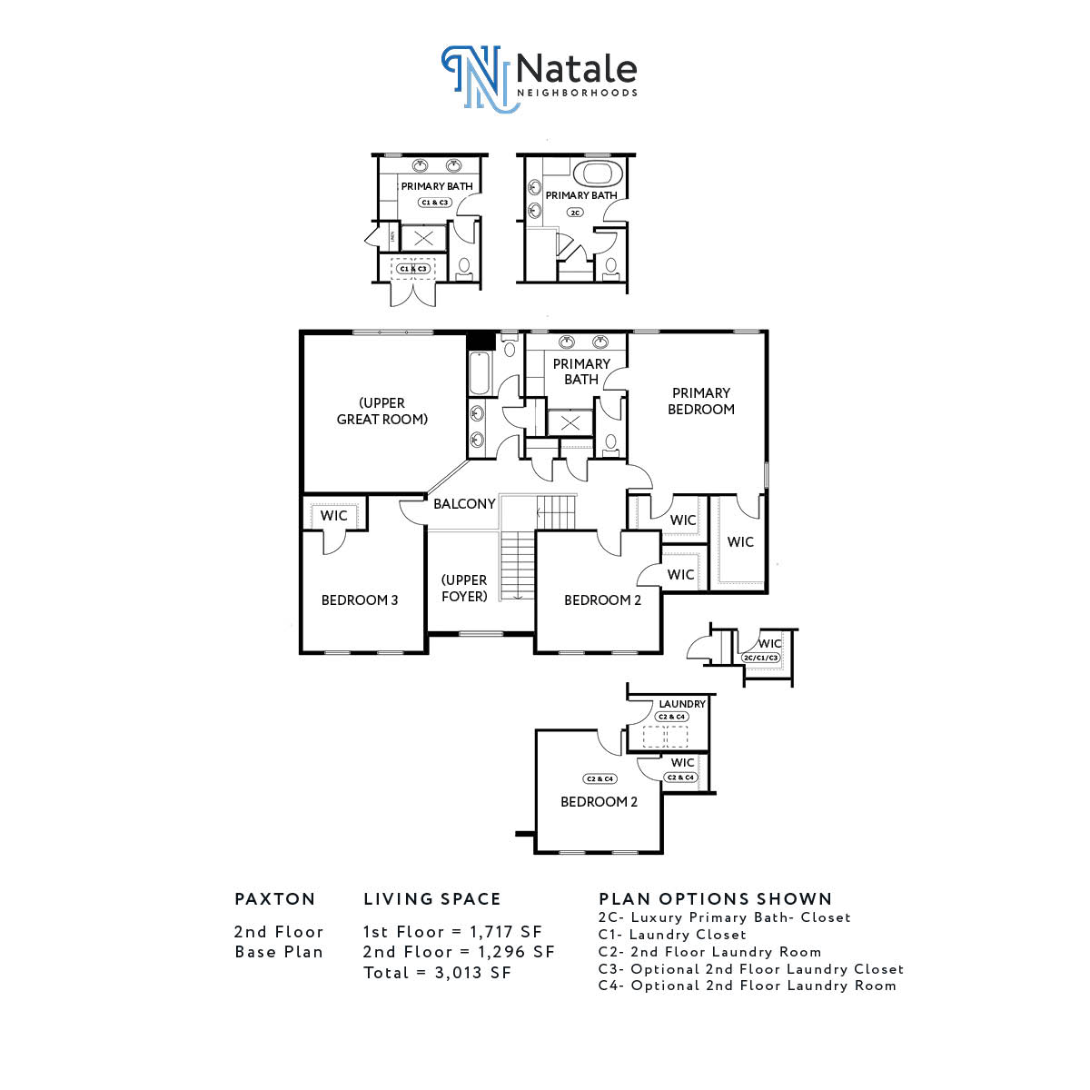 The design of this floorplan offers so many wonderful options! The size of this home ranges from 3,013 – 3,316 square feet. The Paxton offers 3 or 4 bedrooms, 2.5-4 bathrooms, and 2+ garage spaces. The main living area is open and welcoming, the perfect setup for gatherings. The kitchen has a huge, 60” x 60” island, great for food prep and seating for 4. A chef would love this space with plenty of options including additional counterspace and cabinets plus the option for a private preparation kitchen. The main kitchen opens up to a huge dinette space and great room, with your option to add a sunroom with cathedral ceiling at the back of the home. If you love the look of 2 story ceilings, this home has the option for both within the great room and foyer. The main level also features a dining room, study and a mudroom that leads to the garage. We’ve designed this home’s laundry as either 1st or 2nd floor laundry- your choice! On the second level, the primary suite is the main attraction! With options, you can personalize your primary retreat with extra closet space or a luxurious bath with soaking tub. All bedrooms on the second floor are spacious with walk-in closets. Is the Paxton just what you were looking for? Begin your journey today with Natale!