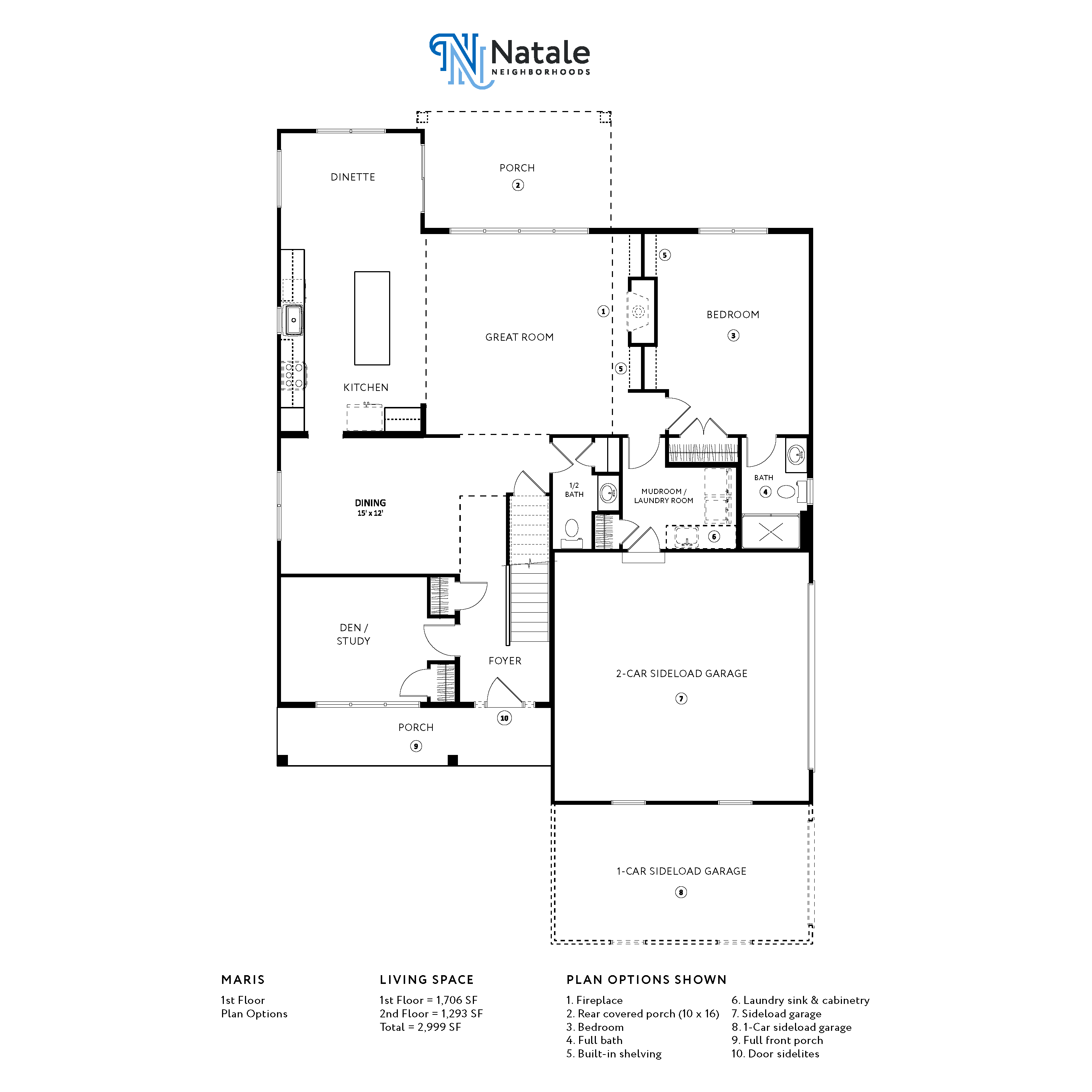 The Maris model offers several additional options that can be customized to suit your needs and preferences. For the first floor, some available options include incorporating a fireplace, adding a laundry sink and cabinetry, adding a built-in bench seat and cubbies in the mudroom, implementing a built-in key drop, adding a rear covered porch, including a bedroom and full bathroom, and choosing a 3 car garage. On the second floor, some options include adding a luxury primary bathroom, a fourth bedroom, a third bathroom, and implementing a box ceiling.