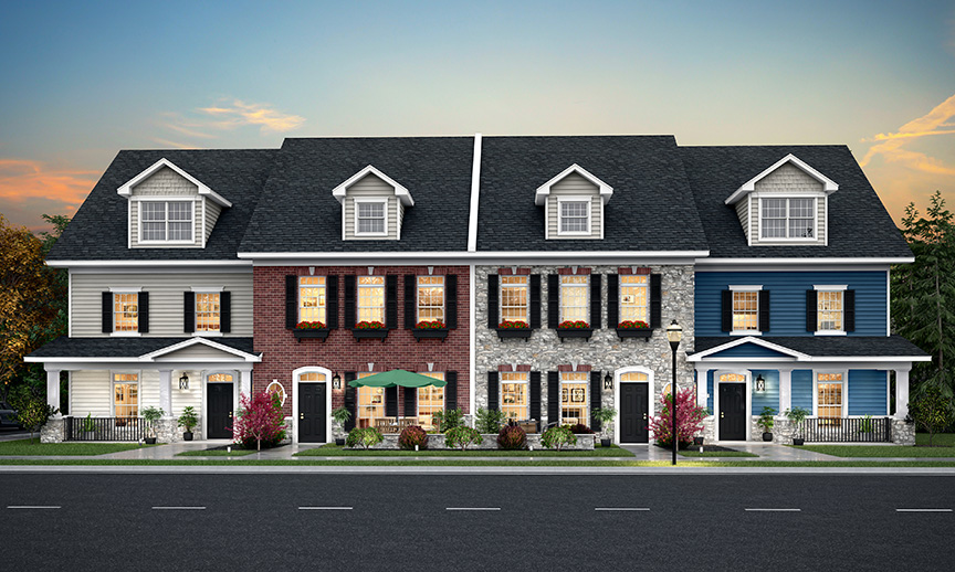 Asher Crossing features stunning townhomes between Milton St. and Lehigh Memorial Trail. Each building showcases a unique exterior of stone, brick, and engineered wood siding, promoting privacy with thoughtfully offset designs and sound insulation between units.