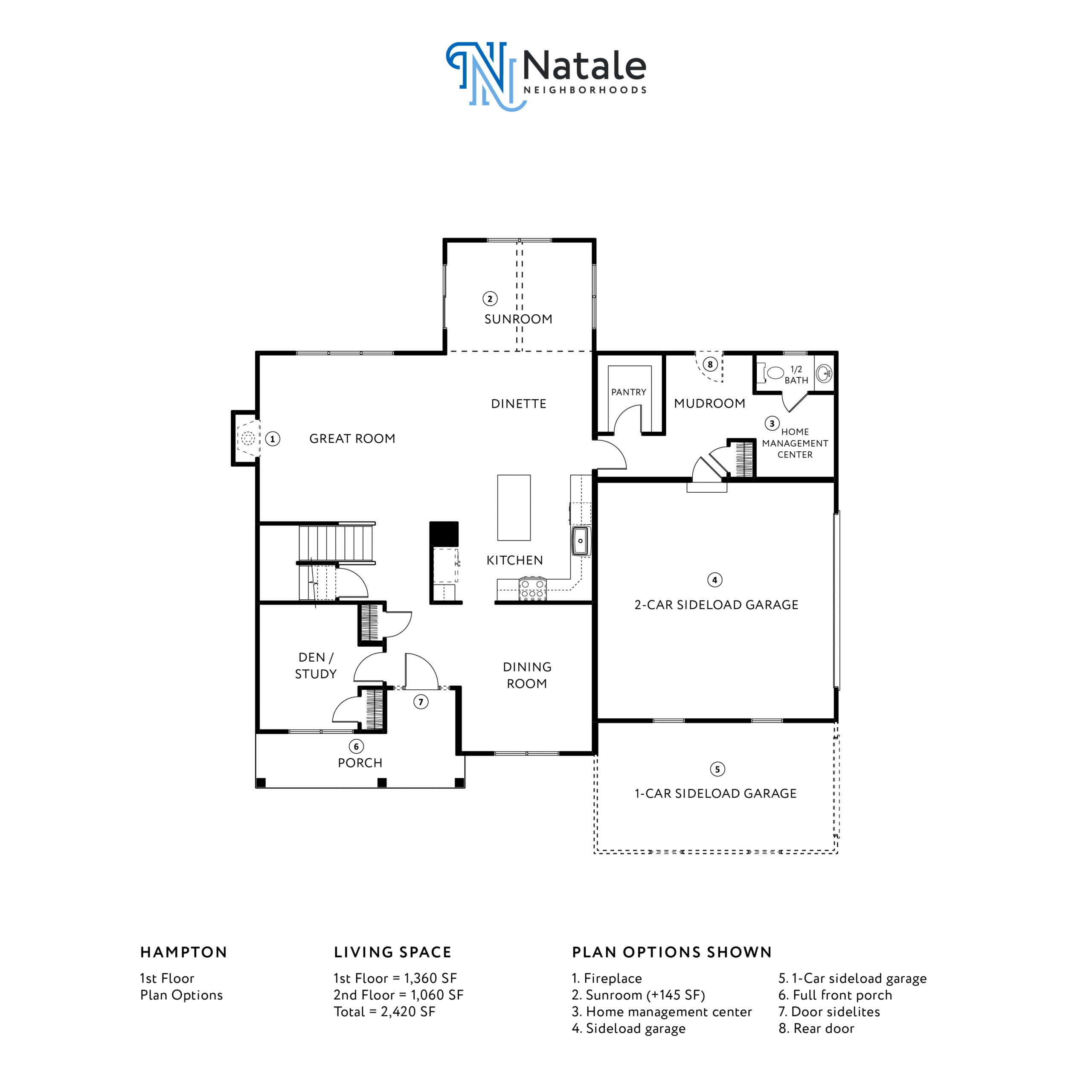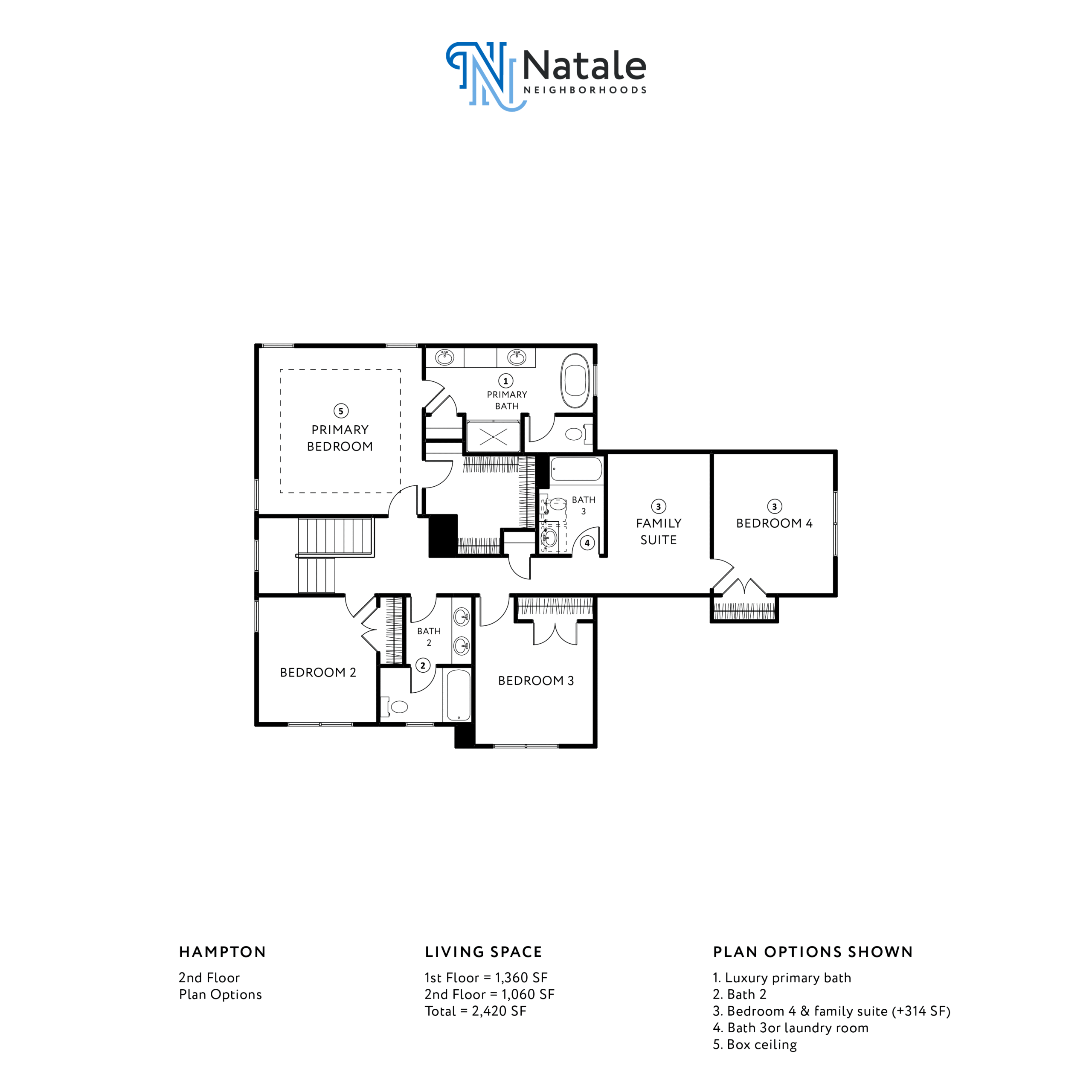 The Hampton model provides a range of additional options that can be tailored to your liking. For the first floor, some available options include incorporating a fireplace, adding a rear covered porch, adding a home management center, and choosing a 3-car garage. As for the second floor, there are numerous options to choose from, including adding a laundry room, luxury primary bath, adding a second full bathroom, adding a fourth bedroom and family suite, adding a third bathroom, and implementing box ceilings. Is this floorplan exactly what you were searching for? Contact Natale today!