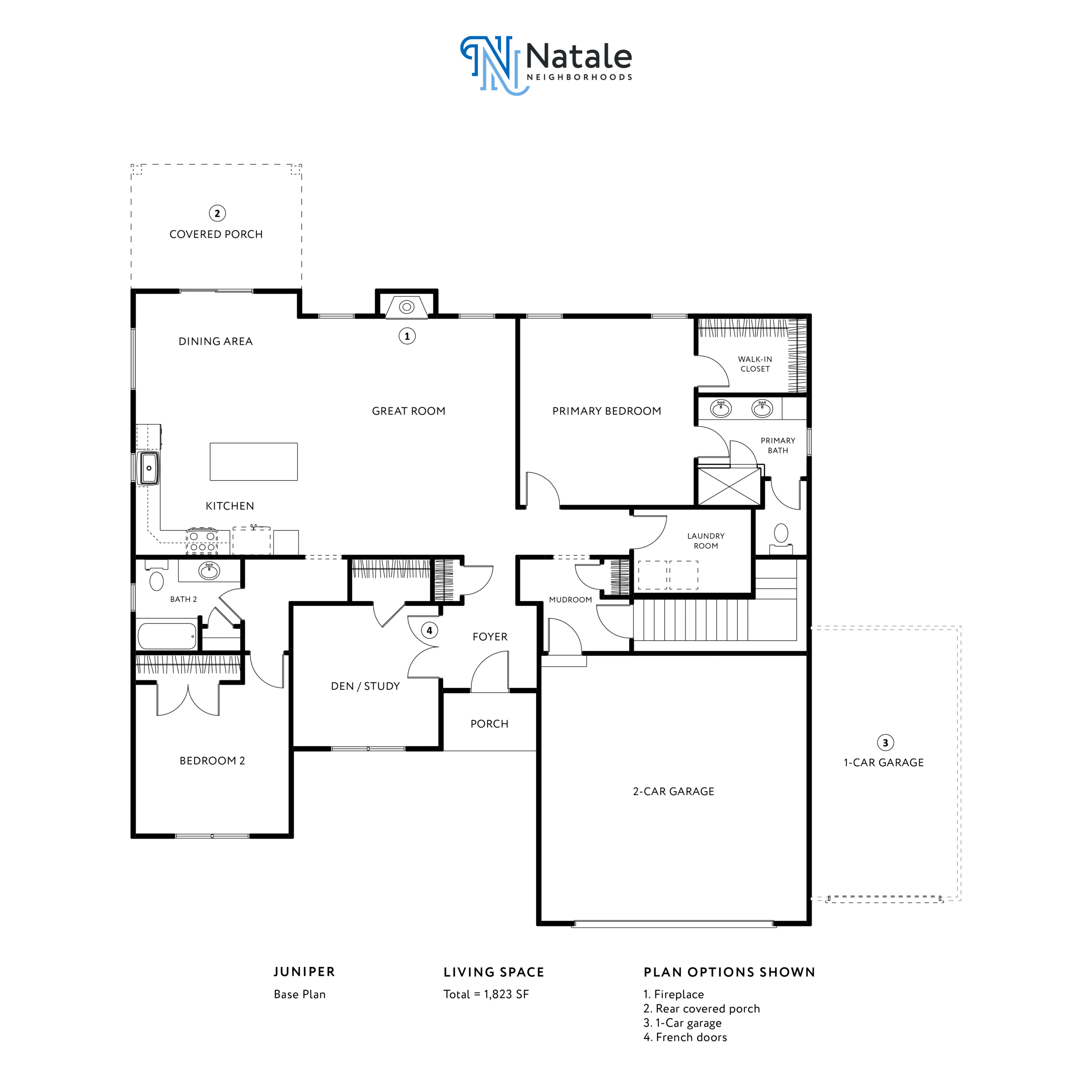 The Juniper model offers a variety of additional options that can be customized to suit your preferences. Some of the plan options include: a fireplace, rear covered porch, 1-car garage, French doors, sunroom, third bedroom, box ceiling, wet bar, sideload garage, 1-car sideload garage, and full front porch. Ready to build your dream home with Natale Builders? Contact us today to get started.