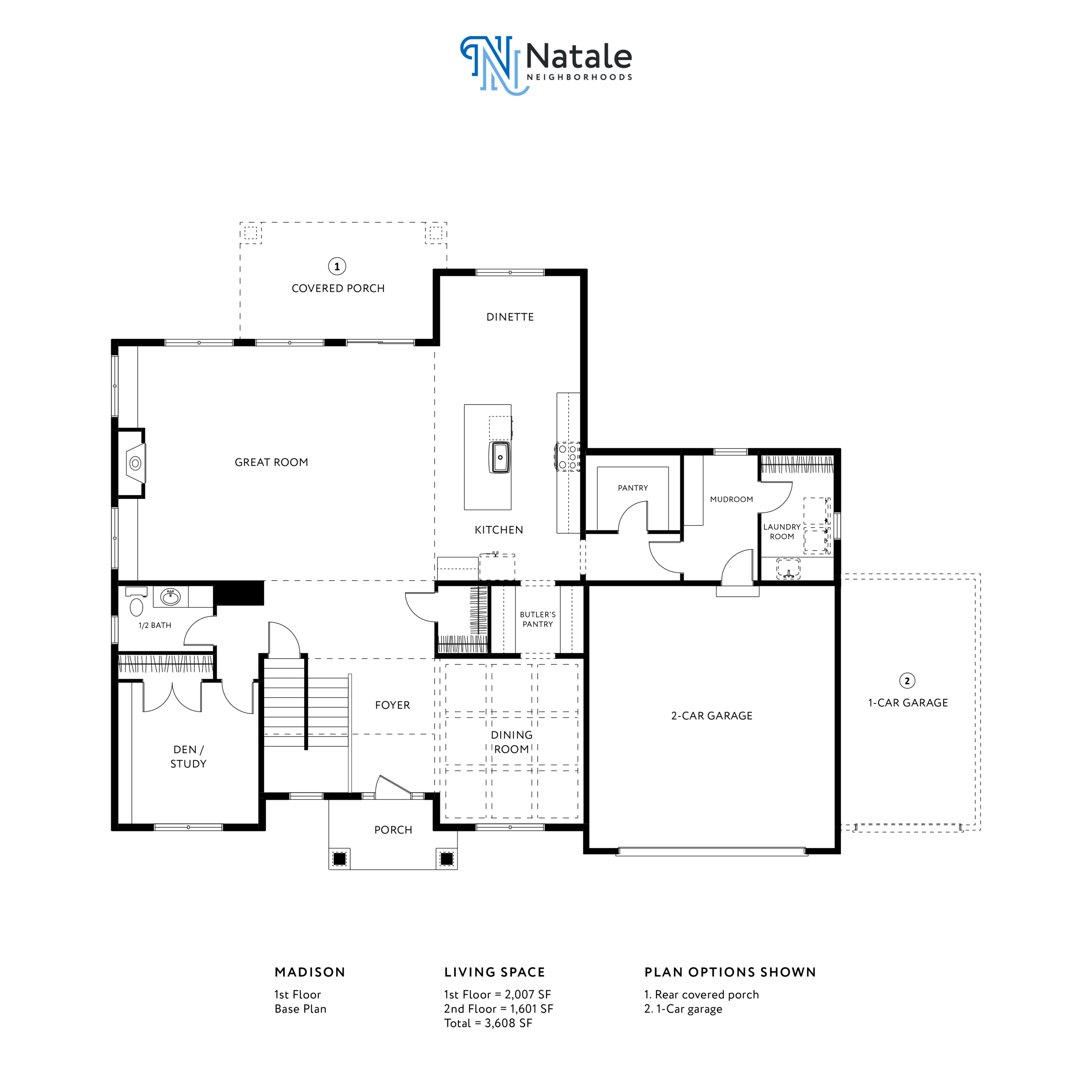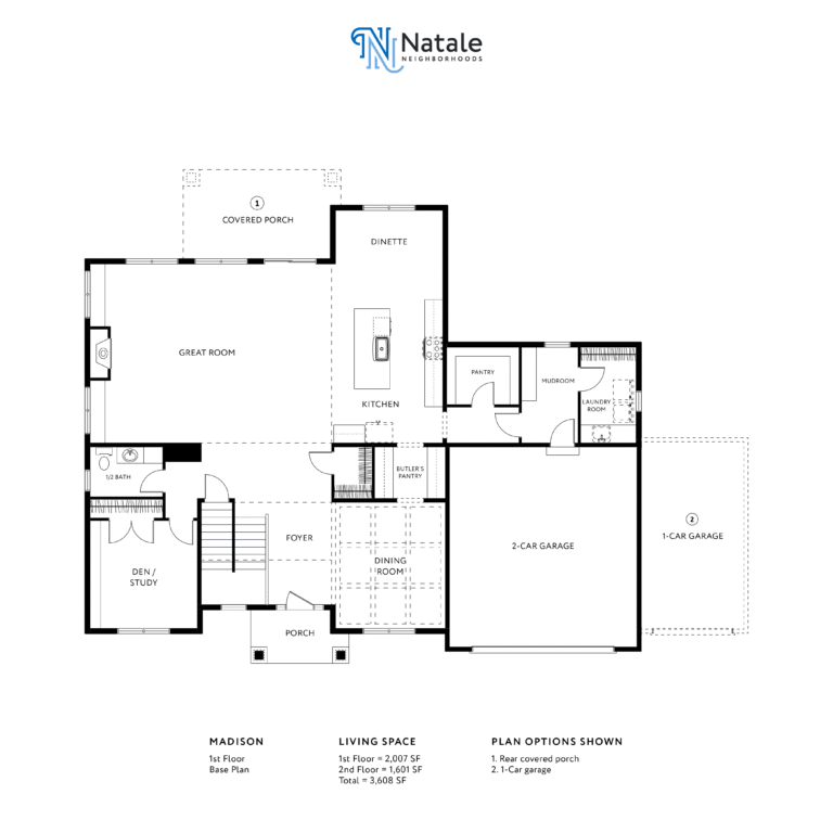 The Madison design offers a variety of customizations to make your home truly unique. You can add a rear covered porch, a sunroom, a food prep kitchen, a home management center, or a wine room to the first floor. You can also opt for a 3-car garage. For the second floor, you can add a laundry room, a luxury primary bathroom, or a box ceiling to further personalize this Natale floorplan.